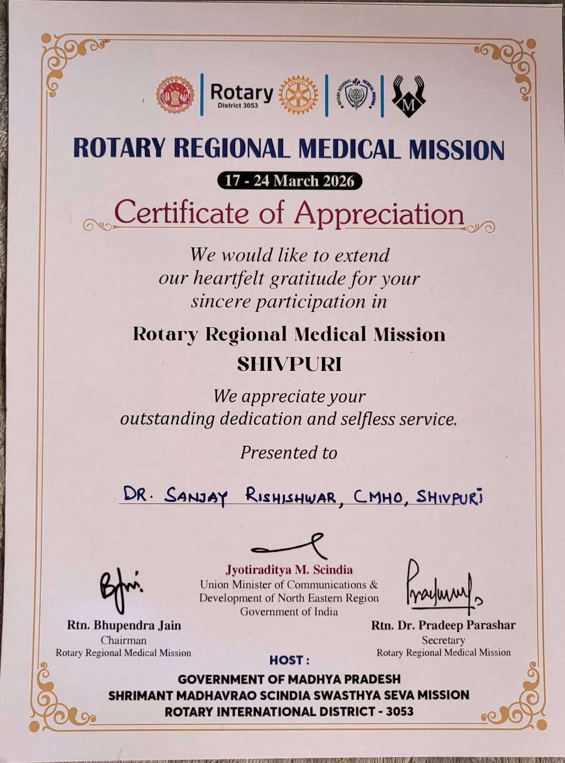 यह शिविर श्रीमंत माधव राव सिंधिया स्वास्थ्य सेवा मिशन, जिला प्रशासन एवं मध्यप्रदेश शासन के सहयोग से, साथ ही रोटरी इंटरनेशनल डिस्ट्रिक्ट 3053 एवं रोटरी क्लब शिवपुरी द्वारा आयोजित रोटरी रीजनल मेडिकल मिशन शिविर के अंतर्गत 17 मार्च से 24 मार्च तक संचालित किया गया।