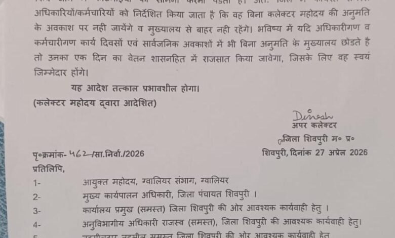 शिवपुरी/ जिले में अफसरों और कर्मचारियों की मनमानी छुट्टियों पर आखिरकार प्रशासन ने लगाम कस दी है। 27 अप्रैल 2026 को कलेक्टर कार्यालय से जारी एक सख्त आदेश ने पूरे सरकारी महकमे में खलबली मचा दी है। अब साफ कर दिया गया है कि बिना कलेक्टर की अनुमति कोई भी अधिकारी-कर्मचारी न तो अवकाश पर जा सकेगा और न ही मुख्यालय छोड़ सकेगा।